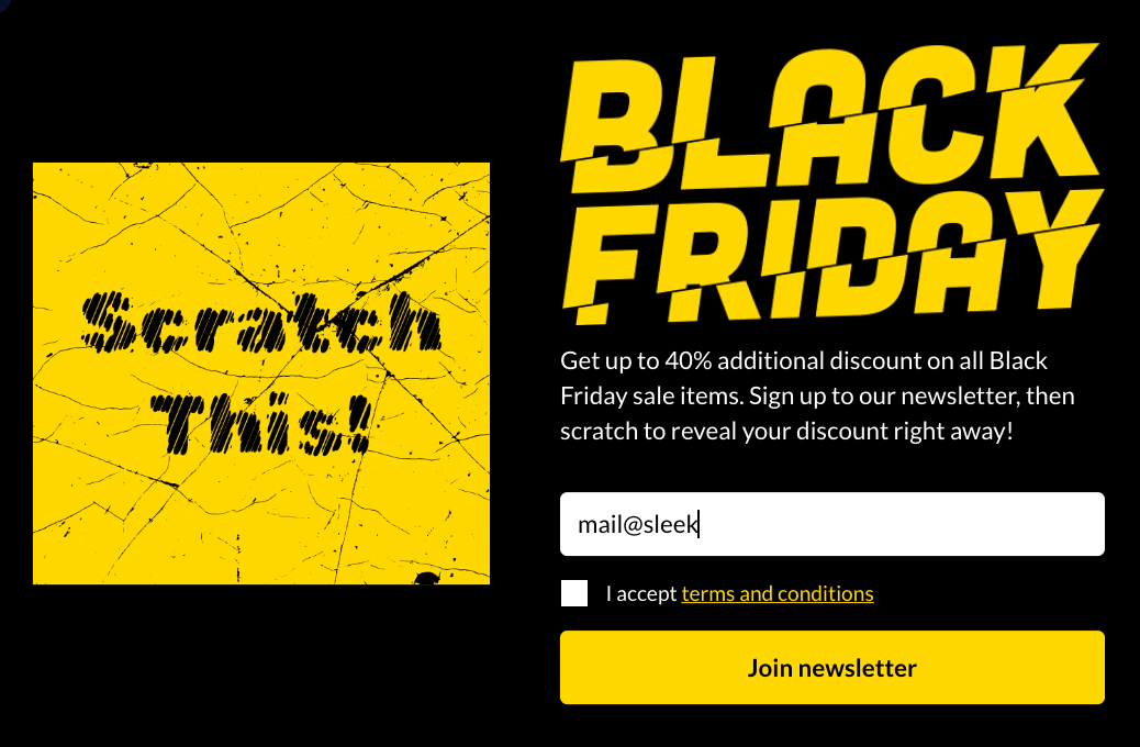 Odwiedzający są proszeni o przesłanie swojego adresu e-mail w celu ujawnienia oferty znajdującej się pod zdrapką. Udowodniono, że to podejście oparte na zachętach przekształca odwiedzających w subskrybentów, którzy chcą odblokować zniżkę z okazji Czarnego Piątku.