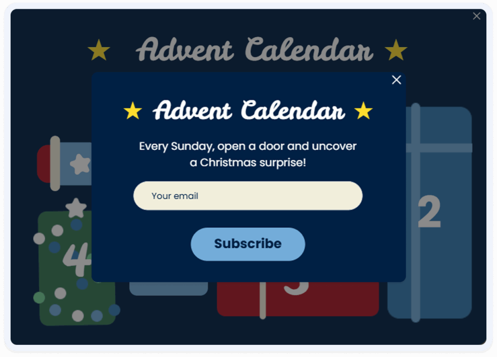Zaskocz swoich odbiorców co tydzień świątecznym kalendarzem adwentowym. Zbuduj emocje, przechwytuj e-maile i spraw, by kupujący wracali przez cały sezon.