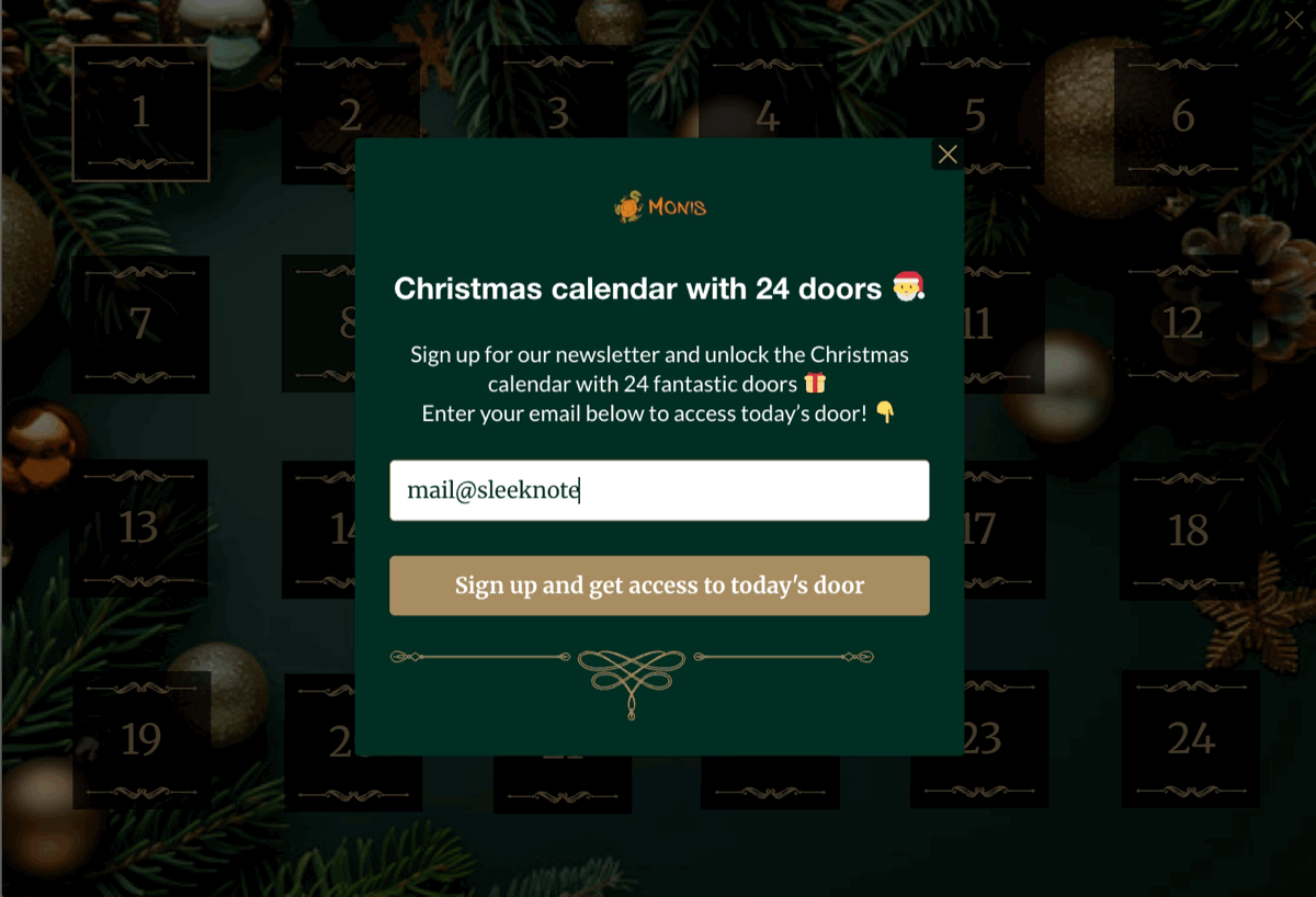 December is usually a quiet month for Monis, so Tommy wanted to give visitors a reason to return to the website again and again. His idea was a Christmas Calendar popup where customers could open a new door each day.