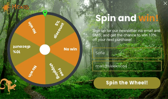 Visitors could spin the wheel for rewards like 5% or 10% discounts and free shipping, adding an element of surprise that made signing up more exciting.
