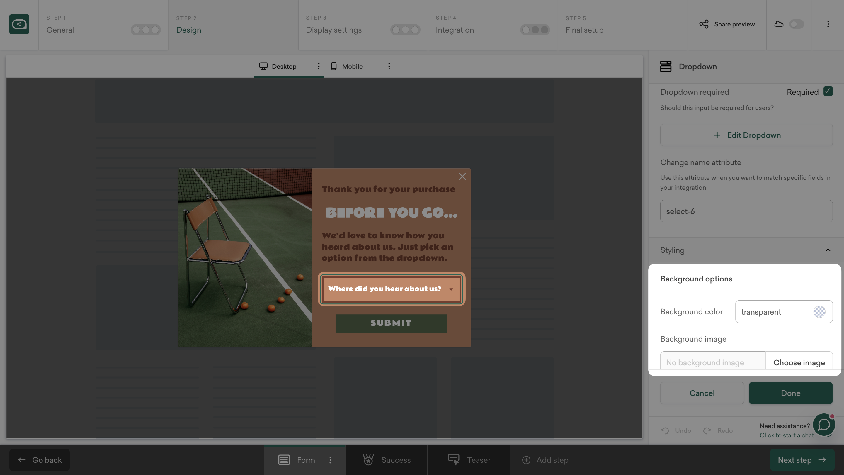 Click the dropdown, then use the right-hand panel to change the background, arrow color, and borders. These small design tweaks help keep the popup visually consistent with your Black Friday theme.